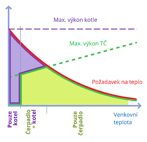 Se zvyšující se venkovní teplotou dodává teplo kotel, kotel spolu s tepelným čerpadlem nebo pouze tepelné čerpadlo