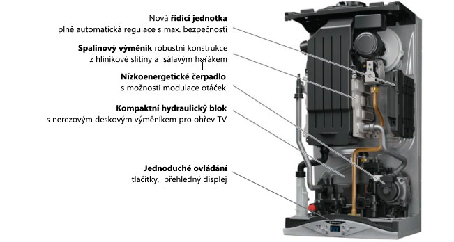 Kondenzační nástěnný kotel s průtokovým systémem s mikroakumulací.